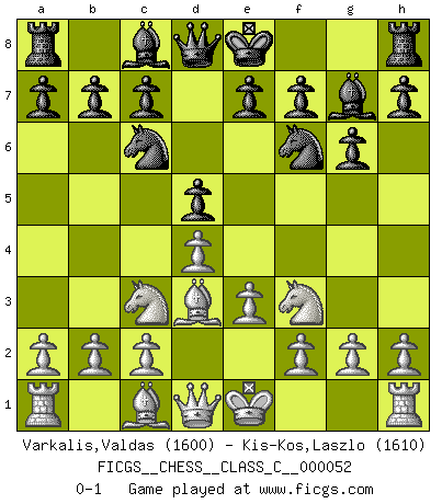 Last move : 0-1 2007 September 9 7:33:35 [Event "FICGS__CHESS__CLASS_C__000052"] [Site "FICGS"] [Date "2007.07.27"] [Round "1"] [White "Varkalis,Valdas"] [Black "Kis-Kos,Laszlo"] [Result "0-1"] [WhiteElo "1600"] [BlackElo "1610"] 1.d4 Nf6 2.e3 g6 3.Nf3 Bg7 4.Nc3 d5 5.Bd3 Nc6 0-1 This chess game has been lost on time (started : 2007.07.27 3:9:6) Queen's pawn game Player Black won this chess game. Follow this game move after move (download)I have never in my life played the French Defence, which is the dullest of all openings. (Wilhelm Steinitz) Spiel ein langweiliges Spiel zu Ende und lustige Dinge können passieren. (Hans Ree) Si yo gano un torneo, yo lo gano por mí mismo. Yo hago las jugadas. Nadie me ayuda. (Bobby Fischer) Les échecs, c'est l'imagination. (David Bronstein) Memory... is the diary that we all carry with us. (Oscar Wilde, The Importance of Being Earnest)