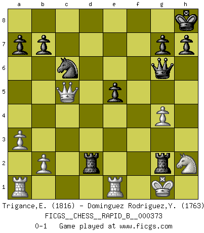 Last move : 0-1 2022 March 11 16:9:41 [Event "FICGS__CHESS__RAPID_B__000373"] [Site "FICGS"] [Date "2022.01.25"] [Round "1"] [White "Trigance,Emile"] [Black "Dominguez Rodriguez,Yosvany"] [Result "0-1"] [WhiteElo "1816"] [BlackElo "1763"] 1.Nf3 c5 2.g3 Nc6 3.Bg2 d5 4.d3 e5 5.O-O Nf6 6.Nbd2 Be7 7.e4 O-O 8.h3 Qc7 9.exd5 Nxd5 10.Re1 Be6 11.Nc4 f6 12.a3 Rad8 13.Qe2 Qd7 14.Ne3 Nxe3 15.Bxe3 Bxh3 16.Bxh3 Qxh3 17.Qf1 Qg4 18.Nh2 Qg6 19.Qg2 c4 20.Qe4 cxd3 21.cxd3 f5 22.Qc4+ Kh8 23.Kg2 f4 24.Bc5 fxg3 25.fxg3 Rxd3 26.g4 Rd2+ 27.Kh1 Bxc5 28.Qxc5 R8f2 29.Kg1 Rg2+ 0-1 Reti Opening Kingside Castling by player White (move 5) Kingside Castling by player Black (move 7) Player Black won this chess game. Follow this game move after move (download)Chess is a foolish expedient for making idle people believe they are doing something very clever when they are only wasting their time. (George Bernard Shaw) Der Freibauer hat für mich eine Seele, genau wie der Mensch, Wünsche, die unerkannt in ihm schlummern, und Befürchtungen, von deren Existenz er selbst kaum ahnt. (Aaron Nimzowitsch) Es el objetivo de la escuela moderna no tratar cada posición de acuerdo a una regla general, sino de acuerdo al principio inherente en la posición. (Richard Reti) Les réformistes prétendent que les progrès de la théorie conduiront à la disparition des échecs, et qu'il faut, pour leur rendre vie, en remanier les règles. En réalité, qu'exprime cette affirmation? Le mépris de l'intuition, de l'imagination et de tous les autres éléments qui font des échecs un art. (Alexander Alekhine) Patience, use the Force, think ! (Obi-Wan Kenobi in Star Wars ep.2)