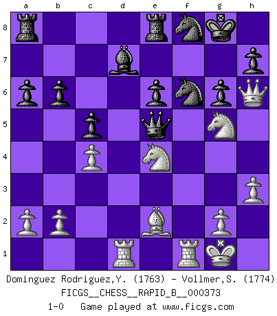 Last move : 1-0 2022 February 12 10:10:42 [Event "FICGS__CHESS__RAPID_B__000373"] [Site "FICGS"] [Date "2022.01.25"] [Round "1"] [White "Dominguez Rodriguez,Yosvany"] [Black "Vollmer,Steve"] [Result "1-0"] [WhiteElo "1763"] [BlackElo "1774"] 1.d4 Nf6 2.c4 g6 3.Nc3 Bg7 4.e4 d6 5.Nf3 O-O 6.Be3 Nbd7 7.Be2 c5 8.d5 a6 9.O-O Qc7 10.h3 e6 11.dxe6 fxe6 12.Qd2 Re8 13.Rad1 Bf8 14.Bh6 Bxh6 15.Qxh6 b6 16.Ng5 Nf8 17.f4 Bd7 18.e5 dxe5 19.fxe5 Qxe5 20.Nce4 1-0 King's Indian : Larsen variation Kingside Castling by player Black (move 5) Kingside Castling by player White (move 9) Player White won this chess game. Follow this game move after move (download)One bad move nullifies forty good ones. (Horowitz) Wer der Ansicht ist, daß alle Schachspieler verrückt sind, wird durch Studium des Lebens von Emil Josef Diemer nicht auf andere Gedanken kommen. (Hans Ree) El Ajedrez tiene tanto misterio como las mujeres. (Purdy) Les échecs, c'est la lutte contre l'erreur. (Johannes Zukertort) Chess is everything: art, science and sport. (Anatoly Karpov)