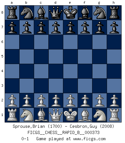 Last move : 0-1 2022 February 24 14:28:49 [Event "FICGS__CHESS__RAPID_B__000373"] [Site "FICGS"] [Date "2022.01.25"] [Round "1"] [White "Sprouse,Brian"] [Black "Cesbron,Guy"] [Result "0-1"] [WhiteElo "1700"] [BlackElo "2008"] 0-1 This chess game has been lost on time (started : 2022.01.25 10:9:18) Player Black won this chess game. Follow this game move after move (download)We cannot resist the fascination of sacrifice, since a passion for sacrifices is part of a Chessplayer's nature. (Rudolf Spielman) Wer nie einen Fehler gemacht hat, hat nie etwas Neues ausprobiert. (Albert Einstein) Mi estilo es algo parecido entre un poco de Tal y Petrosian. (Reshevsky) Les échecs sont un jeu par leur forme, un art par leur essence et une science par sa difficulté d'acquisition. Ils peuvent vous procurer autant de plaisir qu'un bon livre ou une belle musique, mais vous n'aurez une réelle joie que si vous arrivez à bien jouer. (Tigran Petrosian) The problem with manipulation is that people can turn on you. (Horatio Caine, C.S.I. Miami)