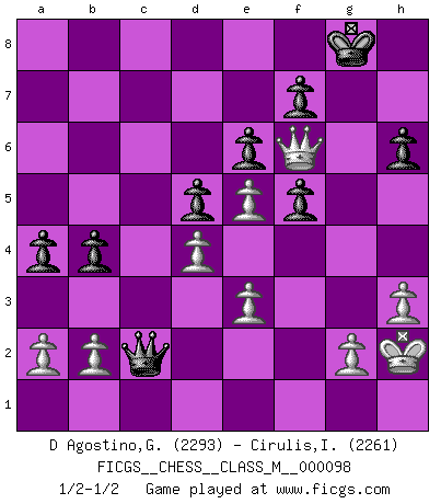 Last move : 1/2-1/2 2022 August 4 19:27:32 [Event "FICGS__CHESS__CLASS_M__000098"] [Site "FICGS"] [Date "2022.01.27"] [Round "1"] [White "D Agostino,Gabriele"] [Black "Cirulis,Ilmars"] [Result "1/2-1/2"] [WhiteElo "2293"] [BlackElo "2261"] 1.d4 d5 2.c4 c6 3.Nf3 Nf6 4.Nc3 e6 5.Bg5 Be7 6.e3 O-O 7.Qc2 Nbd7 8.Rd1 b6 9.Bd3 h6 10.cxd5 cxd5 11.Bh4 Bb7 12.O-O Rc8 13.Qb1 a6 14.Rc1 b5 15.Ne2 Qb6 16.Ne5 Bd6 17.f4 a5 18.Bh7+ Kh8 19.Rxc8 Bxc8 20.Bd3 b4 21.Qc2 Ba6 22.Bxa6 Qxa6 23.Ng3 Kg8 24.Rc1 Nb6 25.Bxf6 Rc8 26.Nc6 gxf6 27.Nh5 f5 28.Qf2 Kh8 29.h3 Nd7 30.Qg3 Rg8 31.Qe1 Rc8 32.Ne5 Nxe5 33.fxe5 Bf8 34.Rxc8 Qxc8 35.Qf2 Qc1+ 36.Kh2 a4 37.Nf6 Bg7 38.Ne8 Qc8 39.Nxg7 Kxg7 40.Qh4 Qc2 41.Qf6+ Kg8 1/2-1/2 QGD Slav : 4.Nc3 Kingside Castling by player Black (move 6) Kingside Castling by player White (move 12) This chess game ended in a draw. Follow this game move after move (download)When asked, -How is that you pick better moves than your opponents?, I responded: I'm very glad you asked me that, because, as it happens, there is a very simple answer. I think up my own moves, and I make my opponent think up his. (Alexander Alekhine) Wenn Dein Gegner dir ein Remis anbietet, versuch herauszufinden, weshalb er glaubt schlechter zu stehen. (Nigel Short) Un mal día en el Ajedrez, es mejor que cualquier buen día en el trabajo. (Anonymous) Il vaut mieux sacrifier les pièces de l'adversaire. (Xavier Tartacover) The only difference between a tax man and a taxidermist is that the taxidermist leaves the skin. (Mark Twain)