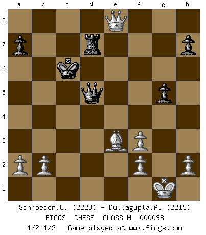Last move : 1/2-1/2 2022 June 24 19:15:15 [Event "FICGS__CHESS__CLASS_M__000098"] [Site "FICGS"] [Date "2022.01.27"] [Round "1"] [White "Schroeder,Christoph"] [Black "Duttagupta,Aniruddha"] [Result "1/2-1/2"] [WhiteElo "2228"] [BlackElo "2215"] 1.e4 c6 2.d4 d5 3.exd5 cxd5 4.c4 Nf6 5.Nc3 Nc6 6.Nf3 Bg4 7.cxd5 Nxd5 8.Qb3 Bxf3 9.gxf3 e6 10.Qxb7 Nxd4 11.Bb5+ Nxb5 12.Qc6+ Ke7 13.Qc5+ Nd6 14.Nxd5+ exd5 15.Qxd5 Qc8 16.O-O Qb7 17.Qe5+ Kd7 18.Rd1 Re8 19.Qf5+ Re6 20.Qxf7+ Be7 21.Bg5 Re8 22.Rxd6+ Rxd6 23.Re1 Qd5 24.Rxe7+ Rxe7 25.Qxe7+ Kc6 26.Bf4 Rd7 27.Qe8 g5 28.Be3 1/2-1/2 Caro-Kann : Panov-Botvinnik attack Kingside Castling by player White (move 16) This chess game ended in a draw. Follow this game move after move (download)It is peculiar but a fact nevertheless, that gamblers in chess always have enthusiastic followers. (Botvinnik) Ich verstehe den Grund nicht, warum die Aufteilung in Frauen und Männer überhaupt im Schach besteht. (Judith Polgar) No existe un remordimiento como el remordimiento del Ajedrez. (H. G. Wells) Les ravages du H expliquent la différence de niveau entre Tal et Thal [Abergel]. Art is the triumph over chaos. (John Cheever)