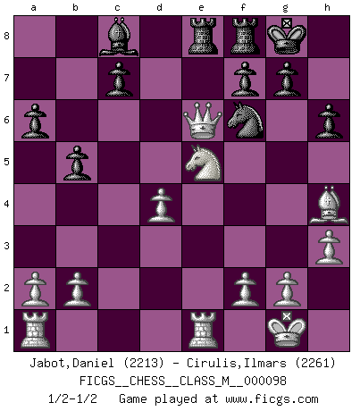 Last move : 1/2-1/2 2022 June 12 20:30:56 [Event "FICGS__CHESS__CLASS_M__000098"] [Site "FICGS"] [Date "2022.01.27"] [Round "1"] [White "Jabot,Daniel"] [Black "Cirulis,Ilmars"] [Result "1/2-1/2"] [WhiteElo "2213"] [BlackElo "2261"] 1.e4 e5 2.Nf3 Nc6 3.Bb5 Nf6 4.O-O d6 5.Re1 Be7 6.c3 O-O 7.h3 a6 8.Ba4 b5 9.Bc2 d5 10.exd5 Qxd5 11.d4 exd4 12.cxd4 Bf5 13.Bb3 Qd7 14.Nc3 Rae8 15.Bg5 h6 16.Bh4 Na5 17.Ne5 Qd8 18.Qf3 Bc8 19.Nd5 Nxb3 20.Nxe7+ Qxe7 21.Qxb3 Qe6 22.Qxe6 1/2-1/2 Ruy Lopez : Berlin defense, 4.O-O, d6 Kingside Castling by player White (move 4) Kingside Castling by player Black (move 6) This chess game ended in a draw. Follow this game move after move (download)Different people feel differently about resigning. (Bobby Fischer) Um sich vor der Gefahr einer Erkältung zu schützen, sorge der wanderlustige König beizeiten für ein brauchbares Versteck. (Aaron Nimzowitsch) Solo el jugador con la iniciativa tiene el derecho a atacar. (Wilhelm Steinitz) Le système Elo représente seulement une moyenne. Il est simplement un indicateur de votre stabilité. (Anatoli Karpov) Creativity is allowing yourself to make mistakes. Art is knowing which ones to keep. (Scott Adams)