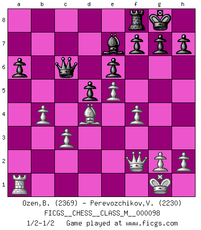 Last move : 1/2-1/2 2022 April 21 20:53:16 [Event "FICGS__CHESS__CLASS_M__000098"] [Site "FICGS"] [Date "2022.01.27"] [Round "1"] [White "Ozen,Bahadir"] [Black "Perevozchikov,Vjacheslav"] [Result "1/2-1/2"] [WhiteElo "2369"] [BlackElo "2230"] 1.e4 e6 2.d4 d5 3.Nc3 Nf6 4.e5 Nfd7 5.f4 c5 6.Nf3 Nc6 7.Be3 cxd4 8.Nxd4 Qb6 9.Qd2 Qxb2 10.Rb1 Qa3 11.Bb5 Nxd4 12.Bxd4 a6 13.Bxd7+ Bxd7 14.Rb3 Qe7 15.Rxb7 Rc8 16.O-O Qd8 17.Qf2 Rxc3 18.Bxc3 Qc8 19.Rb3 Ba4 20.Bd4 Bxb3 21.axb3 Be7 22.c3 O-O 23.b4 Qc6 24.Ra1 1/2-1/2 French : Steinitz, Boleslavsky variation Kingside Castling by player White (move 16) Kingside Castling by player Black (move 22) This chess game ended in a draw. Follow this game move after move (download)One of these modest little moves may be more embarrassing to your opponent than the biggest threat. (Siegbert Tarrasch) Eine Person mit durchschnittlichem IQ kann etwa eine ELO von 2000 erreichen. (Jonathan Levitt) Tu sabes que vas a perder. Aún cuando tenía la ventaja, yo sabía que iba a perder. - al estar jugando con Fischer (Andrew Soltis) Toute estimation doit être constamment réévaluée. (Jacob Estrin) There is far too much law for those who can afford it and far too little for those who cannot. (Derek Bok)