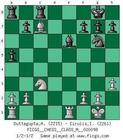 Last move : 1/2-1/2 2022 March 18 4:41:42 [Event "FICGS__CHESS__CLASS_M__000098"] [Site "FICGS"] [Date "2022.01.27"] [Round "1"] [White "Duttagupta,Aniruddha"] [Black "Cirulis,Ilmars"] [Result "1/2-1/2"] [WhiteElo "2215"] [BlackElo "2261"] 1.e4 e5 2.Nf3 Nc6 3.Bc4 Bc5 4.c3 Nf6 5.d3 d6 6.O-O O-O 7.Nbd2 a5 8.h3 Ba7 9.Re1 Be6 10.Bb5 Ne7 11.d4 Ng6 12.Ba4 Nh5 13.Nf1 Nhf4 14.Ng3 exd4 15.Nxd4 Bxd4 16.cxd4 d5 17.Qf3 dxe4 18.Nxe4 Qxd4 19.Bxf4 Qxa4 20.Bxc7 Qc2 21.Qc3 Qxc3 22.Nxc3 Rfc8 1/2-1/2 Giuoco Piano Kingside Castling by player White (move 6) Kingside Castling by player Black (move 6) This chess game ended in a draw. Follow this game move after move (download)There are two classes of men; those who are content to yield to circumstances and who play whist; those who aim to control circumstances, and who play Chess. (Mortimer Collins) Ein unbeabsichtigtes Patt ist der Gipfel der Dummheit. (Anonymous) Un buen jugador siempre tiene buena suerte. (José Raúl Capablanca) Les sacrifices démontrent seulement que quelqu'un a gaffé. (Savielly Tartacover) The real voyage of discovery consists not in seeking new lands but in seeing with new eyes. (Marcel Proust)