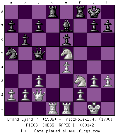 Last move : 1-0 2022 March 23 12:2:1 [Event "FICGS__CHESS__RAPID_D__000142"] [Site "FICGS"] [Date "2022.01.28"] [Round "1"] [White "Brand Lyard,Paul"] [Black "Fraczkowski,Albert"] [Result "1-0"] [WhiteElo "1596"] [BlackElo "1700"] 1.e4 e5 2.Bc4 Nc6 3.Qf3 Nf6 4.d3 Nd4 5.Qd1 d6 6.h3 Be6 7.Bxe6 fxe6 8.Bg5 Be7 9.Bxf6 Bxf6 10.c3 Nc6 11.g3 O-O 12.Nd2 d5 13.Ngf3 dxe4 14.dxe4 Qd7 15.Qb3 b6 16.O-O Be7 17.Rfe1 Na5 18.Qc2 Rad8 19.Rad1 Qc6 20.Nxe5 Qc5 21.Ndf3 1-0 This chess game has been lost on time (started : 2022.01.28 23:41:33) Bishop's Opening Kingside Castling by player Black (move 11) Kingside Castling by player White (move 16) Player White won this chess game. Follow this game move after move (download)Chess is no whit inferior to the violin, and we have a large number of professional violinists. (Mikhail Botvinnik) Wenn sie aufgeben, dann danke ich Ihnen für das Spiel (Eventualzug beim Fernschach). (Anonymous) El arma más poderosa en el Ajedrez, es tener la próxima movida. (David Bronstein) Mais n'est-ce pas déjà le limiter injurieusement que d'appeler les échecs un jeu? N'est-ce pas aussi une science, un art, ou quelque chose qui, comme le cercueil de Mahomet entre ciel et terre, est suspendu entre l'un et l'autre, et qui réunit un nombre incroyable de contraires ? (Stefan Zweig) When you don't know what to do, walk fast and look worried. (Anonymous)