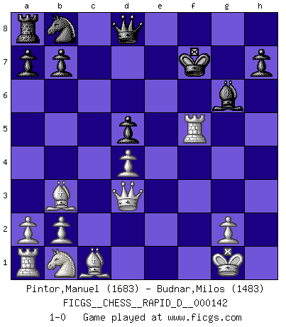 Last move : 1-0 2022 February 4 12:14:34 [Event "FICGS__CHESS__RAPID_D__000142"] [Site "FICGS"] [Date "2022.01.28"] [Round "1"] [White "Pintor,Manuel"] [Black "Budnar,Milos"] [Result "1-0"] [WhiteElo "1683"] [BlackElo "1483"] 1.e4 e5 2.f4 exf4 3.Nf3 g5 4.Bc4 d6 5.O-O Bh6 6.d4 Bg4 7.h3 Bh5 8.Qd3 Ne7 9.h4 Ng6 10.hxg5 Bxg5 11.e5 O-O 12.e6 d5 13.exf7+ Rxf7 14.Bb3 c6 15.c4 Ne7 16.Nxg5 Bg6 17.Nxf7 Kxf7 18.Rxf4+ Nf5 19.cxd5 cxd5 20.Rxf5+ 1-0 KGA : King's knight's gambit Kingside Castling by player White (move 5) Kingside Castling by player Black (move 11) Player White won this chess game. Follow this game move after move (download)A big shock; the best chess player in history has passed away. (Lajos Portisch, about Bobby Fischer's death) Ich moechte nie einem Club beitreten, der Leute wie mich als Mitglieder aufnimmt. (Woody Allen) No soy una persona materialista y por eso, no resiento la falta o pérdida del dinero. La ausencia de cosas mundanas carece de importancia. Ya que el Ajedrez es una forma en la que puedo ser tan materialista como yo desee sin tener la necesidad de vender mi alma. (Jamie Walter Adams) Pour se monter efficace, un Cavalier a besoin d'avant-postes ! Les Cavaliers font les meilleurs bloqueurs de pions passés. Industry executives and analysts often mistakenly talk about strategy as if it were some kind of chess match. But in chess, you have just two opponents, each with identical resources, and with luck playing a minimal role. The real world is much more like a poker game, with multiple players trying to make the best of whatever hand fortune has dealt them. In our industry, Bill Gates owns the table until someone proves otherwise. (David Moschella, 'Computerworld')