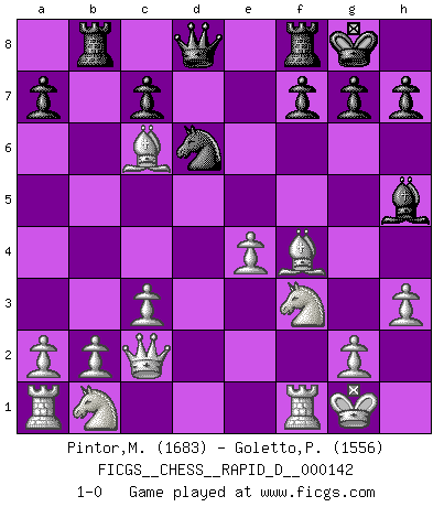 Last move : 1-0 2022 March 15 12:12:4 [Event "FICGS__CHESS__RAPID_D__000142"] [Site "FICGS"] [Date "2022.01.28"] [Round "1"] [White "Pintor,Manuel"] [Black "Goletto,Piero Giuseppe"] [Result "1-0"] [WhiteElo "1683"] [BlackElo "1556"] 1.e4 e5 2.f4 exf4 3.Nf3 Nc6 4.Bc4 d5 5.Bxd5 Bg4 6.c3 Bc5 7.d4 Nf6 8.dxc5 O-O 9.O-O Ne7 10.h3 Bh5 11.Bxb7 Rb8 12.c6 Nxc6 13.Bxc6 Ne8 14.Bxf4 Nd6 15.Qc2 1-0 This chess game has been lost on time (started : 2022.01.28 23:41:33) King's knight's gambit Kingside Castling by player Black (move 8) Kingside Castling by player White (move 9) Player White won this chess game. Follow this game move after move (download)The beauty of a move lies not in its' appearance but in the thought behind it. (Siegbert Tarrasch) Es ist peinlich, dass ich nie Weltmeister wurde. Es wäre leicht, Leonid Breschnjew als Ursache vorzuschieben, dessen Apparat den Vorzeigekommunisten Anatoli Karpow in allem unterstützte. Aber Garri Kasparow zum Beispiel, der ebenfalls von den Sowjets unerwünscht war, hat trotz der Widerstände den WM-Titel erobert. (Viktor Kortschnoi) La última cosa en que Fischer estaba interesado era en tonterías, siempre y cuando el Ajedrez estuviera involucrado. (Elie Agur) Seul un grand joueur sait à quel point il joue faiblement. (Xavier Tartacover) No, I am still playing. (Anatoly Karpov)