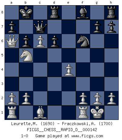 Last move : 1-0 2022 February 9 22:15:8 [Event "FICGS__CHESS__RAPID_D__000142"] [Site "FICGS"] [Date "2022.01.28"] [Round "1"] [White "Leurette,Marc-Antoine"] [Black "Fraczkowski,Albert"] [Result "1-0"] [WhiteElo "1690"] [BlackElo "1700"] 1.e4 e5 2.Nf3 Nc6 3.Bc4 Nd4 4.Nxd4 exd4 5.O-O d6 6.c3 dxc3 7.Nxc3 Be6 8.Bxe6 fxe6 9.d4 Nf6 10.Qb3 b6 11.Qxe6+ Qe7 12.Qc4 O-O-O 13.Qa6+ Kb8 14.d5 c5 15.dxc6 Qc7 16.Nb5 1-0 King's pawn game Kingside Castling by player White (move 5) Queenside Castling by player Black (move 12) Player White won this chess game. Follow this game move after move (download)It is not enough to be a good player... you must also play well. (Siegbert Tarrasch) Der Umstand, daß uns eine 7 Stunden Zeitkontrolle ermöglicht eine großartige, tiefe Partie zu spielen, ist für die Massenmedien nicht weiter von Bedeutung. (Alexej Shirov) Hay jugadores fuertes y personas amables y yo soy un jugador fuerte. (Bobby Fischer) Le temps de noter son nom sur la feuille de partie, j'étais déjà en zeitnot ! D'un modeste amateur apparié lors de la première ronde d'un open contre le grand-maître Azmaïparashvili. Establishing goals is all right if you don't let them deprive you of interesting detours. (Doug Larson)