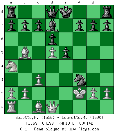Last move : 0-1 2022 March 14 11:44:42 [Event "FICGS__CHESS__RAPID_D__000142"] [Site "FICGS"] [Date "2022.01.28"] [Round "1"] [White "Goletto,Piero Giuseppe"] [Black "Leurette,Marc-Antoine"] [Result "0-1"] [WhiteElo "1556"] [BlackElo "1690"] 1.e4 e5 2.Nf3 Nc6 3.Bb5 Nf6 4.Nc3 Bc5 5.Na4 Nxe4 6.O-O Bxf2+ 7.Rxf2 Nxf2 8.Kxf2 d6 9.d4 Bd7 10.d5 Nd4 11.c3 Nxf3 0-1 This chess game has been lost on time (started : 2022.01.28 23:41:33) Ruy Lopez : Berlin defense Kingside Castling by player White (move 6) Player Black won this chess game. Follow this game move after move (download)When I have White, I win because I am white; When I have Black, I win because I am Bogolyubov. (Bogolyubov) Schon mancher Spieler hat aufgegeben, um zu vermeiden, daß er eine Figur verliert. (Savielly Grigorievitsch Tartakower) El Ajedrez se juega con la mente... ¡no con las manos!. (Renaud y Kahn) 'L'échange des dames est un coup dur pour les deux adversaires...' Un journaliste lors d'une partie du match Spassky-Fischer Coffee just isn't my cup of tea. (Unknown)