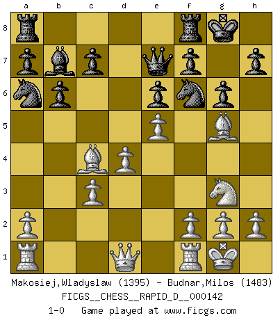 Last move : 1-0 2022 February 8 19:52:1 [Event "FICGS__CHESS__RAPID_D__000142"] [Site "FICGS"] [Date "2022.01.28"] [Round "1"] [White "Makosiej,Wladyslaw"] [Black "Budnar,Milos"] [Result "1-0"] [WhiteElo "1395"] [BlackElo "1483"] 1.d4 Nf6 2.c4 e6 3.Nc3 Bb4 4.e3 Bxc3 5.bxc3 O-O 6.Bd3 g6 7.Ne2 d5 8.O-O b6 9.Ng3 Na6 10.e4 dxc4 11.Bxc4 Bb7 12.Bg5 Qe7 13.e5 1-0 Nimzo-Indian : 4.e3 Kingside Castling by player Black (move 5) Kingside Castling by player White (move 8) Player White won this chess game. Follow this game move after move (download)A man without frontiers. He didn't divide the East and the West, he brought them together in their admiration for him. (Ljubomir Ljubojevic, about Bobby Fischer's death) Warum muß ich gegen diesen IDIOTEN verlieren? (Aaron Nimzowitsch) El Ajedrez moderno está demasiado preocupado con cosas como la estructura de Peones. Olvidenlo, el Jaque Mate termina la partida. (Nigel Short) Les échecs, c'est l'art d'analyser. (Mikhail Botvinnik) They say in chess you've got to kill the queen, and then you mate it... Oh I, do you ? (Red Hot Chili Peppers, Fortune faded)