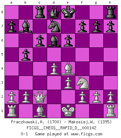 Last move : 0-1 2022 March 19 19:35:53 [Event "FICGS__CHESS__RAPID_D__000142"] [Site "FICGS"] [Date "2022.01.28"] [Round "1"] [White "Fraczkowski,Albert"] [Black "Makosiej,Wladyslaw"] [Result "0-1"] [WhiteElo "1700"] [BlackElo "1395"] 1.d4 d5 2.c4 c6 3.Nc3 Nf6 4.Nf3 e6 5.e3 Nbd7 6.Bd3 dxc4 7.Bxc4 b5 8.Bd3 Bb7 9.Ne4 Nxe4 10.Bxe4 Bd6 11.Qc2 Rc8 0-1 This chess game has been lost on time (started : 2022.01.28 23:41:33) QGD Slav defense Player Black won this chess game. Follow this game move after move (download)There is no remorse like the remorse of Chess. (H. G. Wells) Wir können eben der zündenden Macht des Opfers nicht wiederstehen, denn die Begeisterung für das Opfer liegt in der Natur des Menschen. (Rudolf Spielmann) Yo considero que Fischer es uno de los expertos mas grandes de aperturas de siempre. (Keith Hayward) À la honte des hommes, on sait que les lois du jeu sont les seules qui soient partout justes, claires, inviolables et exécutées. Pourquoi l'Indien qui a donné les règles du jeu d'échecs est-il obéi de bon gré dans toute la terre, et que les décrétales des papes, par exemple, sont aujourd'hui un objet d'horreur et de mépris ? C'est que l'inventeur des échecs combina tout avec justesse pour la satisfaction des joueurs, et que les papes, dans leurs décrétales, n'eurent en vue que leur seul avantage. L'Indien voulut exercer également l'esprit des hommes et leur donner du plaisir; les papes ont voulu abrutir l'esprit des hommes. Voltaire (Dictionnaire philosophique / Garnier 1967) If we don't succeed, we run the risk of failure. (George W. Bush)