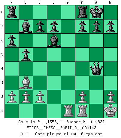 Last move : 0-1 2022 March 26 3:33:46 [Event "FICGS__CHESS__RAPID_D__000142"] [Site "FICGS"] [Date "2022.01.28"] [Round "1"] [White "Goletto,Piero Giuseppe"] [Black "Budnar,Milos"] [Result "0-1"] [WhiteElo "1556"] [BlackElo "1483"] 1.e4 e5 2.Nf3 Nc6 3.Nc3 Bb4 4.Nd5 Bd6 5.Bb5 a6 6.Ba4 b5 7.Bb3 Nf6 8.O-O O-O 9.d4 Nxe4 10.Bg5 Nxg5 11.Rc1 Nxf3 12.Qxf3 Ne7 13.Nxe7+ Qxe7 14.dxe5 Qxe5 15.Rce1 Qf4 16.g3 Qxf3 17.Re3 Qf6 18.g4 Qh4 19.R3e1 Qxg4+ 20.Kh1 Bb7+ 0-1 This chess game has been lost on time (started : 2022.01.28 23:41:33) Three knights game Kingside Castling by player White (move 8) Kingside Castling by player Black (move 8) Player Black won this chess game. Follow this game move after move (download)Look at Garry Kasparov. After he loses, invariably he wins the next game. He just kills the next guy. That's something that we have to learn to be able to do. (Maurice Ashley) Über Kasparov: Es ist offensichtlich, daß er in einem totalitären Staat aufwuchs und deshalb zu diktatorischen Zügen neigt. (Viktor Kortschnoi) Debemos de asegurarnos de que el Ajedrez no se convierta en un lenguaje muerto, muy interesante, pero tan solo para un grupo muy pequeño. (Sytze Faber) Des combinaisons [dans le jeu d'échecs] pareilles à des mélodies. Je crois entendre pour ainsi dire la musique des coups... (Vladimir Nabokov) Hold em is to stud what chess is to checkers. (Johnny Moss)