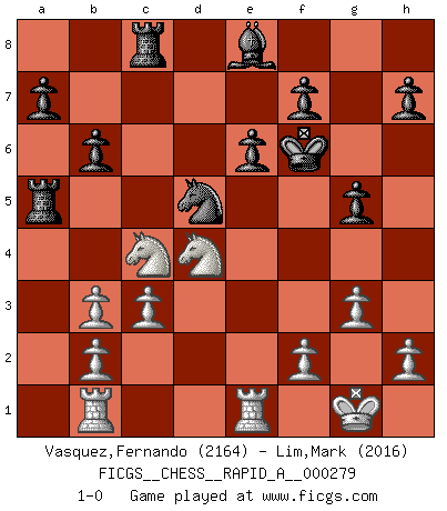 Last move : 1-0 2022 June 6 18:8:5 [Event "FICGS__CHESS__RAPID_A__000279"] [Site "FICGS"] [Date "2022.01.29"] [Round "1"] [White "Vasquez,Fernando"] [Black "Lim,Mark"] [Result "1-0"] [WhiteElo "2164"] [BlackElo "2016"] 1.e4 c5 2.c3 d5 3.exd5 Qxd5 4.d4 g6 5.Na3 cxd4 6.Nb5 Na6 7.Nf3 Nf6 8.Qxd4 Bg7 9.Bc4 Qxd4 10.Nbxd4 O-O 11.O-O Rd8 12.Re1 e6 13.Bf4 Nc5 14.Bc7 Rd7 15.Be5 Rd8 16.Nb3 Na4 17.Rab1 b6 18.Bb5 Bd7 19.Bf1 Nd5 20.Bxg7 Kxg7 21.Ne5 Be8 22.g3 Rac8 23.Nd4 g5 24.Ba6 Rc5 25.Nd3 Ra5 26.Bc4 Rc8 27.Bb3 Nc5 28.Ne5 Nxb3 29.axb3 Kf6 30.Nc4 1-0 This chess game has been lost on time (started : 2022.01.29 1:5:4) Sicilian : Alapin's variation (2.c3) Kingside Castling by player Black (move 10) Kingside Castling by player White (move 11) Player White won this chess game. Follow this game move after move (download)Excellence at Chess is one mark of a scheming mind. (Sir Arthur Conan Doyle) Im Internet Chess Club betrug mein Rating vorübergehend 3350 ELO-Punkte. (Sergej Karjakin) Juega la Apertura como un libro, el Juego Medio como un mago y los Finales como una máquina. (Spielmann) Avec des compensations pour le matériel en plus... (Anonyme) What doesn't kill us makes us stronger. (Friedrich Nietzsche)
