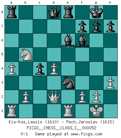 Last move : 0-1 2008 January 30 4:44:19 [Event "FICGS__CHESS__CLASS_C__000052"] [Site "FICGS"] [Date "2007.07.27"] [Round "1"] [White "Kis-Kos,Laszlo"] [Black "Pech,Jaroslav"] [Result "0-1"] [WhiteElo "1610"] [BlackElo "1615"] 1.e4 Nf6 2.e5 Nd5 3.d4 d6 4.c4 Nb6 5.exd6 exd6 6.Nc3 Be7 7.h3 O-O 8.Nf3 Re8 9.Be2 c6 10.O-O Bf5 11.Be3 d5 12.c5 Nc4 13.Bxc4 dxc4 14.Ne5 Be6 15.Qe2 b5 16.cxb6 axb6 17.Rfd1 b5 18.Nxc6 Nxc6 19.Nxb5 Bf6 20.a4 Nb4 21.Qd2 Nd5 22.Re1 Nxe3 0-1 Alekhine's defense : Exchange variation Kingside Castling by player Black (move 7) Kingside Castling by player White (move 10) Player Black won this chess game. Follow this game move after move (download)Fischer sacrificed virtually everything most of us weakies (to use his term) value, respect, and cherish, for the sake of an artful, often beautiful board game, for the ambivalent privilege of being its greatest master. (Paul Kollar) Mit sehr nachdenklichem Gesicht schreitet Bobby durch den Turniersaal. Was ist passiert?, fragt Lombardy. Ich stehe schlecht, antwortet Fischer. Lombardy: Dann biete doch einfach Remis an. Fischer: So schlecht stehe ich nun auch wieder nicht! (Robert James Fischer) Tu sabes, camarada Pachman, no disfruto el ser un Ministro, preferería jugar al Ajedrez como tu. (Che Guevara) Avec des compensations pour le matériel en plus... (Anonyme) Life doesn't imitate art, it imitates bad television. (Woody Allen)