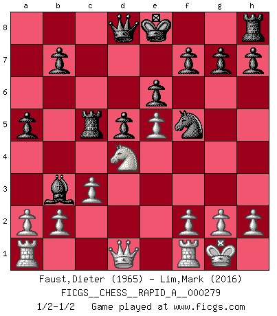 Last move : 1/2-1/2 2022 February 23 9:28:56 [Event "FICGS__CHESS__RAPID_A__000279"] [Site "FICGS"] [Date "2022.01.29"] [Round "1"] [White "Faust,Dieter"] [Black "Lim,Mark"] [Result "1/2-1/2"] [WhiteElo "1965"] [BlackElo "2016"] 1.e4 c6 2.d4 d5 3.e5 c5 4.dxc5 e6 5.Be3 Nd7 6.Bb5 Ne7 7.Bd4 a6 8.Bxd7+ Bxd7 9.c3 a5 10.Nf3 Rc8 11.O-O Nf5 12.Nbd2 Bxc5 13.Bxc5 Rxc5 14.Nb3 Ba4 15.Nfd4 Bxb3 1/2-1/2 Caro-Kann : Advance variation Kingside Castling by player White (move 11) This chess game ended in a draw. Follow this game move after move (download)The King is a fighting piece. Use it ! (Wilhelm Steinitz) Ein Teil des Fehlers ist immer korrekt. (Savielly Grigorievitsch Tartakower) Dejen al perfeccionista jugar por correo. (Yasser Seirawan) Le profane ne songe pas à la somme de jouissance dont il se prive, qui méconnaît ce jeu aux ressources aussi variées que passionnantes. (Jean-Marie Jeanton-Lamarche) Never risk one's whole fortune unless supported by one's entire army. (Niccolo Machiavelli)