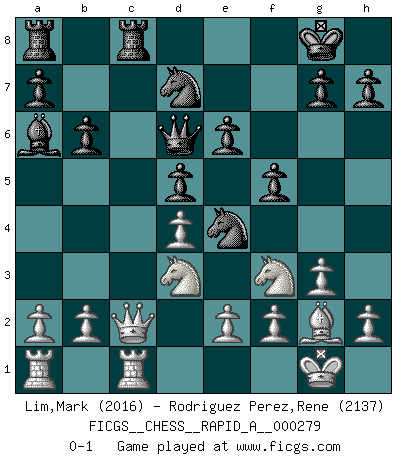 Last move : 0-1 2022 May 14 22:32:33 [Event "FICGS__CHESS__RAPID_A__000279"] [Site "FICGS"] [Date "2022.01.29"] [Round "1"] [White "Lim,Mark"] [Black "Rodriguez Perez,Rene"] [Result "0-1"] [WhiteElo "2016"] [BlackElo "2137"] 1.d4 f5 2.Nf3 Nf6 3.g3 e6 4.Bg2 d5 5.O-O Bd6 6.c4 c6 7.Nbd2 Nbd7 8.Ne1 O-O 9.Nd3 Ne4 10.Qc2 Qe7 11.Nf3 b6 12.cxd5 cxd5 13.Bf4 Ba6 14.Bxd6 Qxd6 15.Rfc1 Rfc8 0-1 This chess game has been lost on time (started : 2022.01.29 1:5:4) Dutch Kingside Castling by player White (move 5) Kingside Castling by player Black (move 8) Player Black won this chess game. Follow this game move after move (download)Chess is above all, a fight ! (Emanuel Lasker) Ich erzeugte keinen Neid, da mich die Schachspieler als Musiker und die Musiker als Schachspieler betrachteten. (Mark Taimanov) Cualquier cambio de material en una posición debe venir por medio de un mate, una captura o promoción de Peón. (Purdy) Lorsque vous vous retrouvez devant une position atroce, ne tendez pas un ultime piège dérisoire avec l'intention d'abandonner si l'adversaire le déjoue ! Faites-vous plutôt un devoir de résister comme si votre vie en dépendait. Jouez le coup qui vous déplairait au centuple si vous étiez dans la peau de votre tortionnaire ! I've never seen so many men wasted so badly. (Blondie in The Good, The Bad and The Ugly)