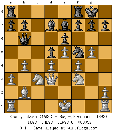 Last move : 0-1 2007 October 15 18:47:42 [Event "FICGS__CHESS__CLASS_C__000052"] [Site "FICGS"] [Date "2007.07.27"] [Round "1"] [White "Szasz,Istvan"] [Black "Bayer,Bernhard"] [Result "0-1"] [WhiteElo "1600"] [BlackElo "1893"] 1.e4 c6 2.d4 d5 3.e5 Bf5 4.g4 Bd7 5.f4 e6 6.g5 c5 7.c3 Nc6 8.Nf3 cxd4 9.cxd4 Nge7 10.Bd3 Nb4 11.a3 Nxd3+ 12.Qxd3 Nf5 13.Nc3 Qb6 14.b4 Be7 15.Bb2 O-O 0-1 Caro-Kann : Advance variation Kingside Castling by player Black (move 15) Player Black won this chess game. Follow this game move after move (download)The essence of Chess is thinking about what Chess is. (David Bronstein) Ich bin stolz ein Bulgare zu sein. (Veselin Topalov) Todos los Maestros de Ajedrez fueron un día unos principiantes. (Chernev) Aidez vos pièces, elles vous aideront. (Paul Morphy) All maxims have their antagonist maxims; proverbs should be sold in pairs, a single one being but a half truth. (William Mathews)