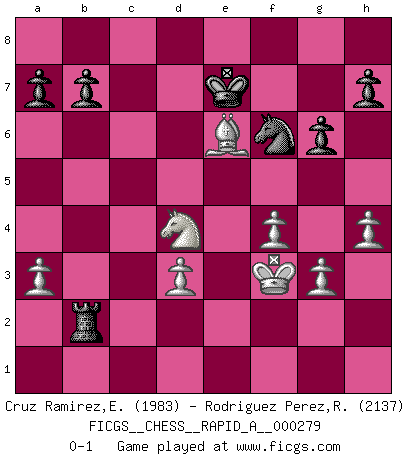 Last move : 0-1 2022 June 7 3:7:54 [Event "FICGS__CHESS__RAPID_A__000279"] [Site "FICGS"] [Date "2022.01.29"] [Round "1"] [White "Cruz Ramirez,Eliecer"] [Black "Rodriguez Perez,Rene"] [Result "0-1"] [WhiteElo "1983"] [BlackElo "2137"] 1.e4 e6 2.d3 d5 3.Nd2 Nf6 4.Ngf3 c5 5.g3 Nc6 6.Bg2 Be7 7.O-O O-O 8.Re1 Qc7 9.exd5 exd5 10.Nf1 d4 11.c3 Bf5 12.cxd4 cxd4 13.Bf4 Bd6 14.Bxd6 Qxd6 15.Rc1 Nb4 16.Nh4 Bg4 17.Qb3 Be6 18.Rxe6 fxe6 19.Nf3 Nbd5 20.N1d2 Rfe8 21.Re1 Re7 22.a3 Rae8 23.Nxd4 Qb6 24.Qxb6 Nxb6 25.Re5 Rd8 26.N2f3 Nbd7 27.Re1 g6 28.Nb3 Rc8 29.Nfd4 Rc7 30.f4 Nc5 31.Nxc5 Rxc5 32.Bf1 Kf7 33.Bg2 Rec7 34.Bh3 Rc1 35.Kf2 Rxe1 36.Kxe1 Rc1+ 37.Ke2 Ke7 38.Bxe6 Rh1 39.h4 Rh2+ 40.Kf3 Rxb2 0-1 French : King's Indian attack Kingside Castling by player White (move 7) Kingside Castling by player Black (move 7) Player Black won this chess game. Follow this game move after move (download)I know people who have all the will in the world, but still can't play good Chess. (Bobby Fischer) Ich bin der einzige Schachspieler, der sich während der Vorbereitungen zum Turnier verletzt hat. (Woody Allen) No hay un Gran Maestro de Ajedrez que sea normal; solo se diferencían ellos por la magnitud de su locura. (Viktor Korchnoi) Vous savez, camarade Pachman, je n'éprouve pas de plaisir à être ministre, je jouerais plutôt aux échecs comme vous, ou alors ferais une révolution au Venezuela. (Che Guevara à Ludek Pachman, 'Checkmate in Prague', 1975) Everybody lies. (Gregory House, House M.D.)