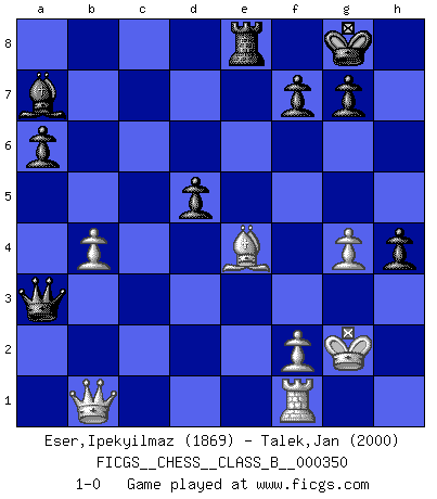 Last move : 1-0 2022 July 9 23:56:25 [Event "FICGS__CHESS__CLASS_B__000350"] [Site "FICGS"] [Date "2022.01.29"] [Round "1"] [White "Eser,Ipekyilmaz"] [Black "Talek,Jan"] [Result "1-0"] [WhiteElo "1869"] [BlackElo "2000"] 1.g3 c6 2.Bg2 e5 3.Kf1 d5 4.b3 Bd6 5.Bb2 Nf6 6.Nf3 e4 7.Nd4 O-O 8.c3 h5 9.h3 Re8 10.Kg1 c5 11.Nc2 Nbd7 12.d3 h4 13.g4 exd3 14.Qxd3 b5 15.Qxb5 Ne5 16.Ne3 a6 17.Qa4 Nexg4 18.Nxg4 Rxe2 19.Bf3 Rxb2 20.Qa3 Bxg4 21.hxg4 Rc2 22.Qa4 Bg3 23.Nd2 Qe7 24.Rd1 Rxd2 25.Rxd2 Qe1+ 26.Kg2 Qxd2 27.Rf1 Re8 28.b4 Bc7 29.Rh1 Bg3 30.Rf1 Bb8 31.Rh1 cxb4 32.Qd1 Qxa2 33.cxb4 Ba7 34.Rf1 Ne4 35.Qb1 Qa3 36.Bxe4 1-0 Benko's Opening Kingside Castling by player Black (move 7) Player White won this chess game. Follow this game move after move (download)I won't play with you anymore. You have insulted my friend. - When an opponent cursed himself for a blunder. (Miguel Najdorf) Es tut gut, die Entwicklungsperiode von, [...] demokratischem Geist durchdringen zu lassen. Wie undemokratisch wäre es doch beispielsweise, den einen Offizier große Spaziertouren vornehmen zu lassen, während die anderen zu Hause säßen und sich entsetzlich langweilten. (Aaron Nimzowitsch) Si el Ajedrez es una ciencia, es la mas inexacta. Si el Ajedrez es un arte, es demasiado inexacto para ser visto como tal. Si el Ajedrez es un deporte, es demasiado esotérico. Si el Ajedrez es un juego, es demasiado exigente para ser solo un juego. Si el Ajedrez es una aventura, es una muy demandante. Si el Ajedrez es una pasión, es una muy gratificante. Si el Ajedrez es la vida, es una muy triste. (Anónimo) Vous m'avez demandé de vous exposer quel est le fondement de la prière. Je ne fais que préparer les pièces du jeu sur la table... Nous sera-t-il permis d'en adopter les règles et si nous les appliquons scrupuleusement nous ne tarderons pas à faire mat le Roi divin ! Il ne pourra échapper à nos mains. (Sainte Thérèse d'Avila, Chemin de perfection) Begin at the beginning and go on till you come to the end; then stop. (Lewis Carrol, Alice in Wonderland)