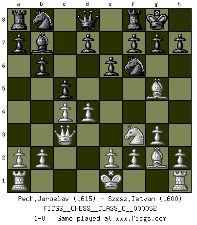 Last move : 1-0 2007 September 17 20:49:12 [Event "FICGS__CHESS__CLASS_C__000052"] [Site "FICGS"] [Date "2007.07.27"] [Round "1"] [White "Pech,Jaroslav"] [Black "Szasz,Istvan"] [Result "1-0"] [WhiteElo "1615"] [BlackElo "1600"] 1.d4 e6 2.c4 b6 3.Nf3 Bb7 4.Nc3 Bb4 5.Qb3 Bxc3+ 6.Qxc3 Nf6 7.g3 O-O 8.Bg2 c5 9.Bg5 1-0 This chess game has been lost on time (started : 2007.07.27 3:9:6) Queen's pawn : Keres defense Kingside Castling by player Black (move 7) Player White won this chess game. Follow this game move after move (download)Adequate compensation for a sacrifice is having a sound combination leading to a winning position; adequate compensation for a blunder is having your opponent snatch defeat from the jaws of victory. (Bruce A. Moon) Ich kenne keine einzige Person, die behaupten würde, Garri Kasparow sei ein guter Mensch (Nigel Short) Hay jugadores fuertes y personas amables y yo soy un jugador fuerte. (Bobby Fischer) Le jeu d'échecs est comme rejeté hors du temps. (Antoine de Saint-Exupéry) If you know the enemy and know yourself you need not fear the results of a hundred battles. (Sun Tzu)