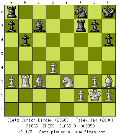 Last move : 1/2-1/2 2022 March 8 18:35:16 [Event "FICGS__CHESS__CLASS_B__000350"] [Site "FICGS"] [Date "2022.01.29"] [Round "1"] [White "Cleto Junior,Dirceu"] [Black "Talek,Jan"] [Result "1/2-1/2"] [WhiteElo "2068"] [BlackElo "2000"] 1.e4 e5 2.Nf3 Nf6 3.Nxe5 d6 4.Nf3 Nxe4 5.d4 d5 6.Bd3 Bd6 7.O-O O-O 8.c4 c6 9.Re1 Re8 10.Qb3 Na6 11.cxd5 cxd5 12.Nc3 Be6 13.a3 h6 14.Be3 Nxc3 15.bxc3 Qc7 16.Bd2 Re7 17.Rab1 Nb8 18.Rxe6 fxe6 19.c4 dxc4 20.Bxc4 Nd7 21.Bxe6+ Kh8 22.Bh3 Qb6 23.Qd1 Qc6 24.Nh4 Nf8 25.Nf5 Rd7 26.Qb3 Bc7 27.Bc3 Qb6 28.g3 Qxb3 29.Rxb3 b6 30.Ne3 Rf7 31.Kg2 1/2-1/2 Petrov : Classical attack, Marshall variation Kingside Castling by player White (move 7) Kingside Castling by player Black (move 7) This chess game ended in a draw. Follow this game move after move (download)Blessed be the memory of him who gave the world this immortal game. (A. G. Gardiner) Garry Kasparov war erst in der Großmeister-Organisation GMA, dann in der Profischach-Vereinigung PCA, zum Schluss kehrte er wieder in den Schoß der FIDE zurück. Aber gut, manche Leute sind flexibel (Viswanathan Anand) El Ajedrez es un terrible juego. Si no controlas el centro, tu oponente tiene una posición mas holgada. Si tienes control del centro, ¡entonces realmente tu tienes algo de que preocuparte!. (Siegbert Tarrasch) Un journaliste : 'Vous préférez avoir une dame de plus sur l'échiquier ou au lit ?' Boris Spassky : 'Ca dépend de la position.' You think that education is too expensive ? Try ignorance. (Derek Bok)