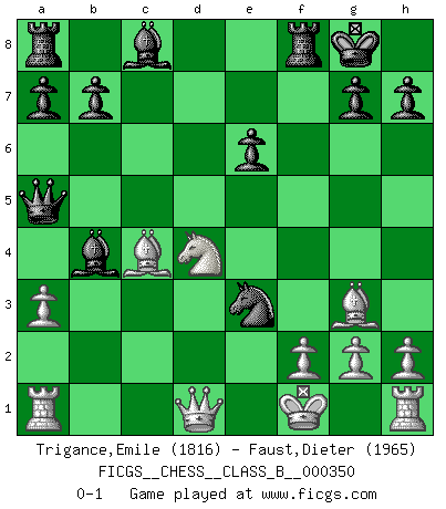 Last move : 0-1 2022 February 25 12:48:8 [Event "FICGS__CHESS__CLASS_B__000350"] [Site "FICGS"] [Date "2022.01.29"] [Round "1"] [White "Trigance,Emile"] [Black "Faust,Dieter"] [Result "0-1"] [WhiteElo "1816"] [BlackElo "1965"] 1.e4 e6 2.d4 d5 3.Nd2 Be7 4.Ngf3 Nf6 5.e5 Nfd7 6.c4 c5 7.Nb3 Nc6 8.Bf4 cxd4 9.a3 f6 10.exf6 Nxf6 11.Nbxd4 O-O 12.Bd3 Nxd4 13.Nxd4 dxc4 14.Bxc4 Nd5 15.Bg3 Qa5+ 16.b4 Bxb4+ 17.Kf1 Ne3+ 0-1 French : Tarrasch Kingside Castling by player Black (move 11) Player Black won this chess game. Follow this game move after move (download)You have to have the fighting spirit. You have to force moves and take chances. (Bobby Fischer) Die unerbitterlichsten Regeln im Schach sind die Ausnahmen. (Savielly Grigorievitsch Tartakower) Nada excita más a Grandes Maestros aburridos que una novedad teórica. (Dominic Lawson) Il vaut toujours mieux jouer un plan faux de façon logique que de n'avoir pas de plan du tout. (Victor Kortchnoï) The mind is like a parachute, it only functions when its open. (Unknown)