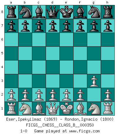 Last move : 1-0 2022 March 13 22:31:57 [Event "FICGS__CHESS__CLASS_B__000350"] [Site "FICGS"] [Date "2022.01.29"] [Round "1"] [White "Eser,Ipekyilmaz"] [Black "Rondon,Ignacio"] [Result "1-0"] [WhiteElo "1869"] [BlackElo "1800"] 1.g3 1-0 This chess game has been lost on time (started : 2022.01.29 10:22:20) Benko's Opening Player White won this chess game. Follow this game move after move (download)Could we look into the head of a Chess player, we should see there a whole world of feelings, images, ideas, emotion and passion. (Alfred Binet) Ein Großmeister muß tausende Partien in seinem Kopf speichern, denn diese sind für Ihn, was die Worte der Muttersprache für gewöhnliche Leute sind, oder Noten für Musiker... (Garry Kasparov) El Ajedrez es un expediente tonto que hace creer a la gente inactiva que hacen una cosa muy astuta cuando solamente estan perdiendo su tiempo. (George Bernard Shaw) Fischer est le meilleur joueur du monde et Karpov n'est qu'un joueur de bistrot. (Garry Kasparov, agé de 16 ans) I find television to be very educating. Every time somebody turns on the set, I go in the other room and read a book. (Groucho Marx)