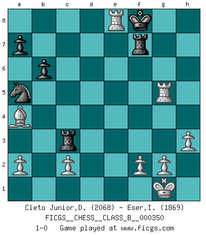 Last move : 1-0 2022 March 28 0:15:39 [Event "FICGS__CHESS__CLASS_B__000350"] [Site "FICGS"] [Date "2022.01.29"] [Round "1"] [White "Cleto Junior,Dirceu"] [Black "Eser,Ipekyilmaz"] [Result "1-0"] [WhiteElo "2068"] [BlackElo "1869"] 1.e4 g6 2.d4 Bg7 3.Nc3 Kf8 4.Nf3 d6 5.Bc4 h6 6.O-O Bg4 7.h3 Bxf3 8.Qxf3 e6 9.Bxe6 Qe8 10.Bb3 Bxd4 11.Nb5 Bb6 12.Be3 Rh7 13.Bxb6 Qxb5 14.Bxc7 Qc5 15.Qc3 Qxc3 16.bxc3 Nc6 17.Bxd6+ Kg7 18.e5 h5 19.Rab1 b6 20.Rfe1 Rd8 21.Rbd1 f6 22.exf6+ Nxf6 23.Ba4 Na5 24.Re7+ Kg8 25.Re6 Rf7 26.Rde1 Rc8 27.Be5 Nd7 28.Rxg6+ Kh7 29.Rg5 Nxe5 30.R1xe5 Rxc3 31.Rxh5+ Kg8 32.Rhg5+ Kf8 33.Re8+ 1-0 Robatsch defense Kingside Castling by player White (move 6) Player White won this chess game. Follow this game move after move (download)Chess mastery essentially consists of analyzing Chess positions accurately. (Mikhail Botvinnik) Obwohl ich alt bin, darf mir niemand den Finger in den Mund stecken, sonst beisse ich. (Wilhelm Steinitz) La batalla por la última verdad nunca sera ganada. Y es por eso que el Ajedrez es tan fascinante. (Hans Kmoch) La vie est comme un jeu d'échecs : nous esquissons un plan, mais celui-ci est tributaire de ce que daignent faire l'adversaire aux échecs et le destin dans la vie. (Arthur Schopenhauer) A belief is an idea the mind possesses, an idea that possesses the mind. (Robert Oxden Bolton)