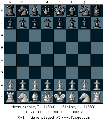 Last move : 0-1 2022 March 1 11:40:11 [Event "FICGS__CHESS__RAPID_C__000279"] [Site "FICGS"] [Date "2022.01.30"] [Round "1"] [White "Hemrungrote,Torpong"] [Black "Pintor,Manuel"] [Result "0-1"] [WhiteElo "1500"] [BlackElo "1683"] 0-1 This chess game has been lost on time (started : 2022.01.30 9:45:37) Player Black won this chess game. Follow this game move after move (download)When you are lonely, when you feel yourself an alien in the world, play Chess. This will raise your spirits and be your counselor in war. (Aristotle) Im Schach nämlich geht es darum, daß Ich des Gegners klein zu kriegen, sein Ego zu zerbrechen und zu zermahlen, seine Selbstachtung zu zertreten und zu verscharren und seine ganze mißachtenswerte sogenannte Persönlichkeit ein für alle Mal tot zu hacken und zu zerstampfen und dadurch die menschliche Gesellschaft von einer stinkenden Pestbeule zu befreien. Es ist ein königliches Spiel. (Robert James Fischer) El Ajedrez es tan interesante por sí solo, que no es necesario un interés monetario para persuadir a una persona a que lo practique; por lo tanto, nunca se juega por dinero. (Benjamin Franklin) Les erreurs sont comme les malheurs, elles n'arrivent jamais seules. (Siegbert Tarrasch) Hardware: the parts of a computer that can be kicked. (Jeff Persis)