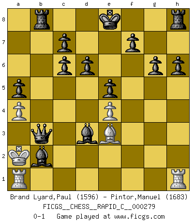 Last move : 0-1 2022 February 4 14:52:2 [Event "FICGS__CHESS__RAPID_C__000279"] [Site "FICGS"] [Date "2022.01.30"] [Round "1"] [White "Brand Lyard,Paul"] [Black "Pintor,Manuel"] [Result "0-1"] [WhiteElo "1596"] [BlackElo "1683"] 1.e4 e5 2.Bc4 Bc5 3.d3 d6 4.h4 h6 5.h5 Nf6 6.g4 Bxg4 7.Ne2 Bxh5 8.a4 a5 9.Nbc3 g6 10.Nd5 Nc6 11.Nxf6+ Qxf6 12.Bb5 Qxf2+ 13.Kd2 Be3+ 14.Kc3 Bxe2 15.Bxc6+ bxc6 16.Qg1 Bd4+ 17.Kb3 Qf6 18.Be3 Qe6+ 19.c4 Rb8+ 20.Ka3 Bxb2+ 21.Ka2 Bxd3 22.Qd1 Qxc4+ 23.Qb3 Qxb3+ 0-1 Bishop's Opening : Classical variation Player Black won this chess game. Follow this game move after move (download)In a gambit you give up a Pawn for the sake of getting a lost game. (Samuel Standige Boden) Es ist wirklich schade, dass so viele Schachspieler nicht auf ihr Äußeres achten! (Alexandra Kosteniuk) Para mi, el Ajedrez es la vida y cada partida es como una nueva vida. Todo jugador de Ajedrez suele vivir muchas vidas durante su vida. (Eduard Gufeld) Aux échecs, les retours au sommet sont rares : les dommages psychologiques consécutifs à une défaite sont trop sévères. (Daily Telegraph) Cactus - It is depressed cucumber. (Ilmars Cirulis)