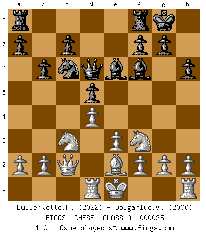 Last move : 1-0 2007 October 8 0:0:10 [Event "FICGS__CHESS__CLASS_A__000025"] [Site "FICGS"] [Date "2007.07.29"] [Round "1"] [White "Bullerkotte,Frank"] [Black "Dolganiuc,Victor"] [Result "1-0"] [WhiteElo "2022"] [BlackElo "2000"] 1.d4 d5 2.c4 e6 3.Nc3 Nf6 4.Bg5 Be7 5.e3 h6 6.Bh4 O-O 7.Nf3 b6 8.Bxf6 Bxf6 9.cxd5 exd5 10.Qb3 Be6 11.Rd1 Nc6 12.Be2 Qd6 13.Qc2 1-0 QGD : 4.Bg5 Be7 Kingside Castling by player Black (move 6) Player White won this chess game. Follow this game move after move (download)I won't play with you anymore. You have insulted my friend. - When an opponent cursed himself for a blunder. (Miguel Najdorf) Schach ist ein Teil der Kultur, und wenn es mit der Kultur abwärts geht, geht es auch mit dem Schach abwärts. (Mikhail Moiseyevich Botvinik) Dejen al perfeccionista jugar por correo. (Yasser Seirawan) Vous m'avez demandé de vous exposer quel est le fondement de la prière. Je ne fais que préparer les pièces du jeu sur la table... Nous sera-t-il permis d'en adopter les règles et si nous les appliquons scrupuleusement nous ne tarderons pas à faire mat le Roi divin ! Il ne pourra échapper à nos mains. (Sainte Thérèse d'Avila, Chemin de perfection) Depression is just anger without enthusiasm. (Unknown)