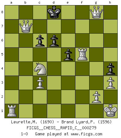 Last move : 1-0 2022 February 5 19:37:50 [Event "FICGS__CHESS__RAPID_C__000279"] [Site "FICGS"] [Date "2022.01.30"] [Round "1"] [White "Leurette,Marc-Antoine"] [Black "Brand Lyard,Paul"] [Result "1-0"] [WhiteElo "1690"] [BlackElo "1596"] 1.e4 e5 2.Nf3 Nc6 3.Bc4 Bc5 4.c3 d6 5.b4 Bb6 6.a4 a6 7.a5 Ba7 8.d3 Bg4 9.h3 Bxf3 10.Qxf3 f6 11.O-O h5 12.Bxg8 h4 13.Bd5 g5 14.Bxg5 Rf8 15.Qh5+ Kd7 16.Qg4+ Ke8 17.Bh6 Rh8 18.Qg7 Rf8 19.Qg6+ Kd7 20.Bxf8 Qxf8 21.Qf5+ Kd8 22.b5 axb5 23.a6 Bxf2+ 24.Qxf2 Kd7 25.Qb2 Qh6 26.axb7 Qe3+ 27.Kh1 Qxd3 28.bxa8Q Ne7 29.Na3 Nxd5 30.exd5 Ke7 31.Qg8 Qxd5 32.Qxd5 Kd7 33.Qb2xb5+ Ke7 34.Nc4 f5 35.Rxf5 c6 36.Qb7+ Kd8 37.Qg8+ 1-0 Giuoco Piano Kingside Castling by player White (move 11) Promotion Queen by player White (move 28) Player White won this chess game. Follow this game move after move (download)The tactician knows what to do when there is something to do; whereas the strategian knows what to do when there is nothing to do. (Gerald Abrahams) Es gibt keine einzige Frau, der ich nicht einen Springer vorgeben könnte und trotzdem gewänne. (Robert James Fischer) El Ajedrez es una hermosa aventura. (Bent Larsen) Les Cavaliers se révèlent fort utiles dans les positions fermées. D'habitude, les Fous sont un peu plus forts que les Cavaliers dans les positions ouvertes. Qu'on le veuille ou non, il restera toujours des exceptions ! Luck is when opportunity knocks and you answer. (Anonymous)