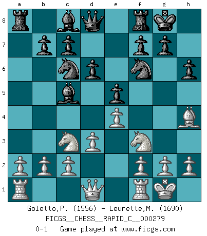 Last move : 0-1 2022 March 14 11:44:42 [Event "FICGS__CHESS__RAPID_C__000279"] [Site "FICGS"] [Date "2022.01.30"] [Round "1"] [White "Goletto,Piero Giuseppe"] [Black "Leurette,Marc-Antoine"] [Result "0-1"] [WhiteElo "1556"] [BlackElo "1690"] 1.e4 e5 2.Nf3 Nc6 3.Nc3 Nf6 4.Bb5 Bd6 5.O-O a6 6.d3 axb5 7.Nxb5 Bc5 8.Nc3 O-O 9.Bg5 h6 10.Bh4 d6 0-1 This chess game has been lost on time (started : 2022.01.30 9:45:37) Four knights : Spanish variation Kingside Castling by player White (move 5) Kingside Castling by player Black (move 8) Player Black won this chess game. Follow this game move after move (download)He who takes the Queen's Knight's Pawn will sleep in the streets. (Anonymous) Besser ein falscher Plan, logisch durchgeführt, als gar kein Plan. (Viktor Kortschnoi) Dios mío, Bobby Fischer juega tan simple. (Alexei Suetin) Psychologiquement, tu dois avoir confiance en toi même, mais cette confiance doit être basée sur des faits. (Robert Fischer) Ah, beer! The cause of, and the solution to, all of life's problems. (Homer Simpson)