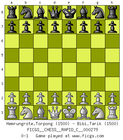 Last move : 0-1 2022 March 1 11:40:11 [Event "FICGS__CHESS__RAPID_C__000279"] [Site "FICGS"] [Date "2022.01.30"] [Round "1"] [White "Hemrungrote,Torpong"] [Black "Bibi,Tarik"] [Result "0-1"] [WhiteElo "1500"] [BlackElo "1500"] 0-1 This chess game has been lost on time (started : 2022.01.30 9:45:37) Player Black won this chess game. Follow this game move after move (download)Who is your opponent tonight, tonight I am playing against the Black pieces. (Akiba Rubinstein) Bogoljubow: Matt in vier Zügen! Tartakower: Ich verbitte mir jede Belästigung! (Savielly Grigorievitsch Tartakower) Muchos se han convertido en Maestros de Ajedrez, nadie se ha convertido en el Maestro del Ajedrez. (Siegbert Tarrasch) Les échecs sont plus proches de l'art de l'assassinat que de l'art de la guerre. (Arturo Perez-Reverte) Happy endings are just stories that haven't finished yet. (Jane Smith in Mr & Mrs Smith)
