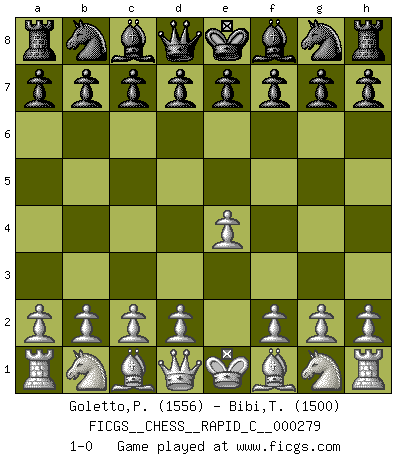 Last move : 1-0 2022 March 1 23:56:12 [Event "FICGS__CHESS__RAPID_C__000279"] [Site "FICGS"] [Date "2022.01.30"] [Round "1"] [White "Goletto,Piero Giuseppe"] [Black "Bibi,Tarik"] [Result "1-0"] [WhiteElo "1556"] [BlackElo "1500"] 1.e4 1-0 This chess game has been lost on time (started : 2022.01.30 9:45:37) King's pawn Opening Player White won this chess game. Follow this game move after move (download)Winning isn't everything... but losing is nothing. (Mednis) Wenn Du absolut nicht mehr weißt, was Du tun sollst, dann ist es Zeit für Panik. (John van der Wiel) La enorme capacidad mental, en la que sin ella no puede un jugador de Ajedrez existir, es demasiado requerida por el Ajedrez al grado de que nunca podrá liberar su mente de este juego. (Albert Einstein) Des combinaisons [dans le jeu d'échecs] pareilles à des mélodies. Je crois entendre pour ainsi dire la musique des coups... (Vladimir Nabokov) Once you start thinking you have nothing left to learn, you have everything to learn. (Steve Badget)