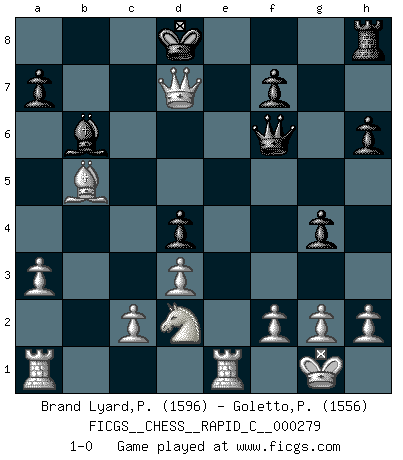 Last move : 1-0 2022 February 27 19:1:1 [Event "FICGS__CHESS__RAPID_C__000279"] [Site "FICGS"] [Date "2022.01.30"] [Round "1"] [White "Brand Lyard,Paul"] [Black "Goletto,Piero Giuseppe"] [Result "1-0"] [WhiteElo "1596"] [BlackElo "1556"] 1.e4 e5 2.Bc4 Nc6 3.d3 Nf6 4.Bg5 h6 5.Bxf6 Qxf6 6.Nf3 d5 7.exd5 Nd4 8.Nxd4 exd4 9.Bb5+ c6 10.Bc4 Bb4+ 11.Nd2 Bf5 12.a3 Ba5 13.b4 Bb6 14.dxc6 bxc6 15.b5 cxb5 16.Bxb5+ Kd8 17.O-O g5 18.Re1 Bd7 19.Qf3 g4 20.Qxa8+ Bc8 21.Qd5+ Bd7 22.Qxd7+ 1-0 Bishop's Opening Kingside Castling by player White (move 17) Player White won this chess game. Follow this game move after move (download)Chess is a part of culture and if a culture is declining then Chess too will decline. (Mikhail Botvinnik) Im Internet Chess Club betrug mein Rating vorübergehend 3350 ELO-Punkte. (Sergej Karjakin) Para mi, el Ajedrez es la vida y cada partida es como una nueva vida. Todo jugador de Ajedrez suele vivir muchas vidas durante su vida. (Eduard Gufeld) Tous ces prétendus hommes politiques sont les pions, les Cavaliers, les Tours ou les Fous d'une partie d'échecs qui se jouera tant qu'un hasard ne renversera pas l'échiquier. (Honoré de Balzac) Man is reluctant to give credit for intelligence to anyone, except his enemies. (Albert Einstein)