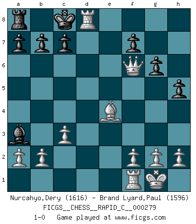 Last move : 1-0 2022 February 26 9:26:11 [Event "FICGS__CHESS__RAPID_C__000279"] [Site "FICGS"] [Date "2022.01.30"] [Round "1"] [White "Nurcahyo,Dery"] [Black "Brand Lyard,Paul"] [Result "1-0"] [WhiteElo "1616"] [BlackElo "1596"] 1.e4 e5 2.Nf3 Nc6 3.c3 d6 4.d3 Bg4 5.Be3 Bxf3 6.Qxf3 Qf6 7.Qg3 g6 8.Bg5 Qe6 9.Be2 h6 10.Be3 d5 11.Bg4 Qd6 12.Na3 h5 13.Bh3 dxe4 14.dxe4 Qd3 15.Rd1 Qxe4 16.Bd7+ Ke7 17.O-O Nf6 18.Bc5+ Kd8 19.Bxc6 Kc8 20.Bxe4 Bxc5 21.Qxe5 Bxa3 22.Qxf6 Rd8 23.Rxd8+ 1-0 Ponziani Opening Kingside Castling by player White (move 17) Player White won this chess game. Follow this game move after move (download)Let the perfectionist play postal. (Yasser Seirawan) Wenn Capablanka heute auf der Schachbühne erscheinen würde, hätte er ein halbes Jahr gebraucht um sich die Schachtheorie anzueignen. Und dann hätte er alles und jeden besiegt. (Mikhail Moiseyevich Botvinik) No puedes jugar al Ajedrez si eres de corazón noble. (Proverbio Francés) On est toujours la mazette de quelqu'un d'autre. (Anonyme) Unless I accept my faults I will most certainly doubt my virtues. (Hugh Prather)