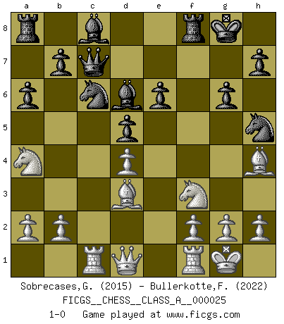 Last move : 1-0 2007 December 5 8:21:54 [Event "FICGS__CHESS__CLASS_A__000025"] [Site "FICGS"] [Date "2007.07.29"] [Round "1"] [White "Sobrecases,Guy"] [Black "Bullerkotte,Frank"] [Result "1-0"] [WhiteElo "2015"] [BlackElo "2022"] 1.e4 e6 2.d4 d5 3.Nd2 Nf6 4.e5 Nfd7 5.Bd3 c5 6.c3 Nc6 7.Ne2 cxd4 8.cxd4 f6 9.exf6 Nxf6 10.O-O Bd6 11.Nf3 O-O 12.Nc3 a6 13.Bg5 Qc7 14.Bh4 Nh5 15.Rc1 g6 16.Na4 1-0 This chess game has been lost on time (started : 2007.07.29 15:3:35) French : Tarrasch, Closed variation Kingside Castling by player White (move 10) Kingside Castling by player Black (move 11) Player White won this chess game. Follow this game move after move (download)Chess demands total concentration. (Bobby Fischer) Ich verachte die Medien. (Robert James Fischer) Morphy probablemente fue el genio más grande de todos. (Bobby Fischer) Pour se monter efficace, un Cavalier a besoin d'avant-postes ! Les Cavaliers font les meilleurs bloqueurs de pions passés. There's no money in correspondence chess. (John Knudsen)