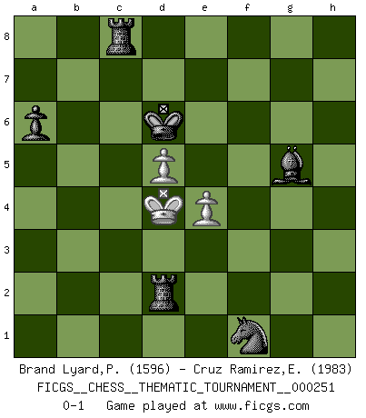 Last move : 0-1 2022 March 3 2:6:42 [Event "FICGS__CHESS__THEMATIC_TOURNAMENT__000251"] [Site "FICGS"] [Date "2022.01.30"] [Round "1"] [White "Brand Lyard,Paul"] [Black "Cruz Ramirez,Eliecer"] [Result "0-1"] [WhiteElo "1596"] [BlackElo "1983"] 1.d4 d5 2.Nf3 Nf6 3.c4 e6 4.Nc3 c6 5.Qd3 dxc4 6.Qxc4 b5 7.Qd3 a6 8.g4 Nxg4 9.Ne5 Nxe5 10.Qe4 Ng6 11.Rg1 Be7 12.Rxg6 hxg6 13.Bf4 g5 14.Be3 f5 15.Qd3 Rxh2 16.a4 Bb7 17.axb5 cxb5 18.f4 Qc7 19.fxg5 Qg3+ 20.Kd2 f4 21.Qg6+ Kd7 22.Qxg7 Qxe3+ 23.Kc2 b4 24.Qe5 Qxe5 25.dxe5 bxc3 26.bxc3 Nc6 27.Rd1+ Kc7 28.Rd3 Nxe5 29.Rd4 Bxg5 30.c4 Ng4 31.Kd3 e5 32.Rd5 Bxd5 33.cxd5 Ne3 34.Kd2 Nxf1+ 35.Kd3 Kd6 36.Kc4 e4 37.Kd4 f3 38.exf3 Rc8 39.fxe4 Rd2+ 0-1 Queen's pawn game 10 pieces endgame at move 38 : White KPP , Black KRRBNPP WHITE : King + 2 Pawns BLACK : King + 2 Rooks 1 Bishop 1 Knight 2 Pawns 9 pieces endgame at move 39 : White KPP , Black KRRBNP WHITE : King + 2 Pawns BLACK : King + 2 Rooks 1 Bishop 1 Knight 1 Pawn Player Black won this chess game. Follow this game move after move (download)The essence of Chess is thinking about what Chess is. (David Bronstein) Das ganze Leben mit einer Ehefrau ist wie ein Endspiel mit ungleichfarbigen Läufern. (Viktor Kortschnoi) La belleza de un movimiento no se refleja solo en su apariencia, sino en el pensamiento detrás de él. (Siegbert Tarrasch) Aidez vos pièces, elles vous aideront. (Paul Morphy) Convictions are more dangerous enemies of truth than lies. (Friedrich Nietzsche)