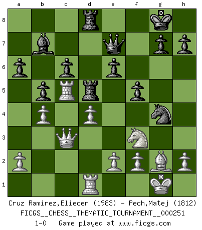 Last move : 1-0 2022 May 28 3:43:13 [Event "FICGS__CHESS__THEMATIC_TOURNAMENT__000251"] [Site "FICGS"] [Date "2022.01.30"] [Round "1"] [White "Cruz Ramirez,Eliecer"] [Black "Pech,Matej"] [Result "1-0"] [WhiteElo "1983"] [BlackElo "1812"] 1.d4 d5 2.Nf3 Nf6 3.c4 e6 4.Nc3 c6 5.Qd3 dxc4 6.Qxc4 b5 7.Qd3 a6 8.g4 Nxg4 9.Bg2 Bb7 10.Bg5 Be7 11.Bxe7 Qxe7 12.Ne4 Nd7 13.Rc1 O-O 14.O-O Rad8 15.Rfd1 f5 16.Nc5 Nxc5 17.Rxc5 Rd5 18.b4 Rfd8 19.Qc3 1-0 This chess game has been lost on time (started : 2022.01.30 23:23:53) Queen's pawn game Kingside Castling by player Black (move 13) Kingside Castling by player White (move 14) Player White won this chess game. Follow this game move after move (download)A thorough understanding of the typical mating continuations makes the most complicated sacrificial combinations leading up to them not only not difficult, but almost a matter of course. (Siegbert Tarrasch) Zum Sieg gelangt man nicht, wenn man gut, sondern nur wenn man besser spielt (Savielly Grigorievitsch Tartakower) El Ajedrez, como cualquier otra actividad creativa, puede existir solo a través de méritos combinados de aquellos que tienen talento creativo y de aquellos que tienen la habilidad de organizar un trabajo creativo. (Mikhail Botvinnik) Le thème de l'attaque double intervient d'une manière ou d'une autre dans l'immense majorité des combinaisons. (Youri Averbakh) The mind is like a parachute, it only functions when its open. (Unknown)