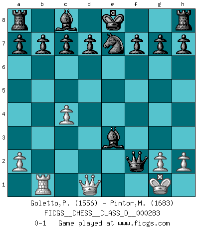 Last move : 0-1 2022 March 27 19:3:30 [Event "FICGS__CHESS__CLASS_D__000283"] [Site "FICGS"] [Date "2022.02.03"] [Round "1"] [White "Goletto,Piero Giuseppe"] [Black "Pintor,Manuel"] [Result "0-1"] [WhiteElo "1556"] [BlackElo "1683"] 1.e4 e5 2.Nf3 Nc6 3.Nc3 Bc5 4.Bb5 Qf6 5.O-O Nge7 6.d4 exd4 7.Nd5 Nxd5 8.Bd2 Nde7 9.e5 Nxe5 10.Nxe5 Qxe5 11.Be3 dxe3 12.fxe3 Bxe3+ 13.Rf2 Qxb5 14.c4 Qxb2 15.Rb1 Qxf2+ 0-1 Three knights game Kingside Castling by player White (move 5) Player Black won this chess game. Follow this game move after move (download)Why must I lose to this idiot ? (Aron Nimzovich) Der Freibauer hat für mich eine Seele, genau wie der Mensch, Wünsche, die unerkannt in ihm schlummern, und Befürchtungen, von deren Existenz er selbst kaum ahnt. (Aaron Nimzowitsch) El jugador táctico debe saber que hacer cuando algo se debe de hacer. El estratégico debe saber que hacer cuando nada se debe de hacer. (Savielly Tartakover) Il (Jacob Murray) ne joue pas pour le bon coup, mais pour le meilleur. (Eloi Relange) Control your own destiny or someone else will. (Jack Welch)