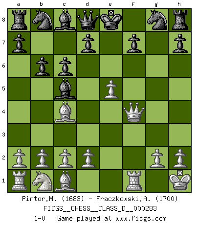 Last move : 1-0 2022 February 11 10:22:17 [Event "FICGS__CHESS__CLASS_D__000283"] [Site "FICGS"] [Date "2022.02.03"] [Round "1"] [White "Pintor,Manuel"] [Black "Fraczkowski,Albert"] [Result "1-0"] [WhiteElo "1683"] [BlackElo "1700"] 1.e4 e5 2.f4 exf4 3.Nf3 g5 4.Bc4 g4 5.O-O gxf3 6.Qxf3 Bc5+ 7.Kh1 b6 8.e5 c6 9.Qxf4 1-0 KGA : Muzio gambit Kingside Castling by player White (move 5) Player White won this chess game. Follow this game move after move (download)Could we look into the head of a Chess player, we should see there a whole world of feelings, images, ideas, emotion and passion. (Alfred Binet) Die größte Kunst beim Schach besteht darin dem Gegner nicht zu zeigen was er tun kann. (Garry Kasparov) Si tu oponente no puede hacer nada activo, entonces no apures la posición; En vez de eso, dejalo estar sentado ahí, sufriendo y rogandote por un empate. (Jeremy Silman) Même si l'adversaire joue le coup analysé précédemment, recommencez l'analyse en voyant la nouvelle position. Première règle de Blumenfeld Programmer - an organism that turns coffee into software. (Anonymous)
