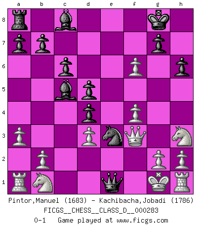 Last move : 0-1 2022 May 24 16:42:53 [Event "FICGS__CHESS__CLASS_D__000283"] [Site "FICGS"] [Date "2022.02.03"] [Round "1"] [White "Pintor,Manuel"] [Black "Kachibacha,Jobadi"] [Result "0-1"] [WhiteElo "1683"] [BlackElo "1786"] 1.e4 e5 2.f4 Bc5 3.Nf3 d6 4.Bc4 Nf6 5.d4 exd4 6.e5 Ng4 7.Ng5 d5 8.Bd3 h6 9.Nh3 Qh4+ 10.Kf1 Nc6 11.Qf3 Nb4 12.Bb5+ c6 13.Bd3 Nxd3 14.cxd3 O-O 15.a3 f6 16.exf6 Re8 17.Bd2 Re3 18.Bxe3 Nxe3+ 19.Kg1 Qe1+ 0-1 KGD : Classical variation Kingside Castling by player Black (move 14) Player Black won this chess game. Follow this game move after move (download)Not all artists are Chess players, but all Chess players are artists. (Marcel Duchamp) Ich spiele ehrlich und spiele, um zu gewinnen. Wenn ich verliere nehme ich meine Medizin. (Robert James Fischer) Los asuntos humanos son como una partida de Ajedrez: solo aquellos que no lo toman seriamente, pueden ser llamados buenos jugadores. (Hung Tzu Ch'eng) Nous sommes les pions de la mystérieuse partie d'Echecs jouée par Dieu. Il nous déplace, nous arrête, nous pousse encore, puis nous lance un à un dans la boîte du Néant. Epitaphe sur la tombe de David Janowsky (1868-1927). Hardware: the parts of a computer that can be kicked. (Jeff Persis)