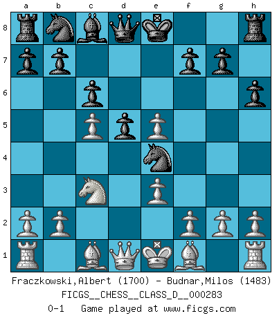 Last move : 0-1 2022 March 19 6:54:46 [Event "FICGS__CHESS__CLASS_D__000283"] [Site "FICGS"] [Date "2022.02.03"] [Round "1"] [White "Fraczkowski,Albert"] [Black "Budnar,Milos"] [Result "0-1"] [WhiteElo "1700"] [BlackElo "1483"] 1.d4 d5 2.c4 c6 3.Nc3 Nf6 4.Nf3 h6 5.e3 e5 6.Nxe5 Bd6 7.c5 Bxe5 8.dxe5 Ne4 0-1 This chess game has been lost on time (started : 2022.02.03 22:34:47) QGD Slav defense Player Black won this chess game. Follow this game move after move (download)There are two classes of men; those who are content to yield to circumstances and who play whist; those who aim to control circumstances, and who play Chess. (Mortimer Collins) Oft bringt ein stiller Zug das Erdbeben. (Richard Reti) El Jaque al descubierto es el bombardero del tablero. (Reuben Fine) Je ne suis pas le dernier à jouer lâchement des coups douteux pendant le zeïtnot de l'adversaire pour l'achever: en effet les coups qui font le plus peur sont ceux que l'on ne comprend pas. Je me fais souvent peur quand je joue. (Un professeur anonyme) The difference between stupidity and genius is that genius has its limits. (Murphy)