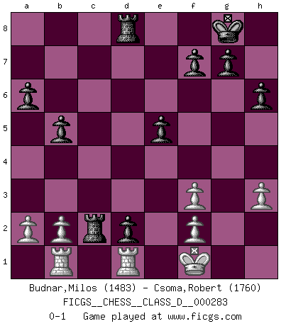 Last move : 0-1 2022 March 23 6:4:19 [Event "FICGS__CHESS__CLASS_D__000283"] [Site "FICGS"] [Date "2022.02.03"] [Round "1"] [White "Budnar,Milos"] [Black "Csoma,Robert"] [Result "0-1"] [WhiteElo "1483"] [BlackElo "1760"] 1.e4 c5 2.Nf3 d6 3.d4 cxd4 4.Nxd4 Nf6 5.Bb5+ Bd7 6.Bxd7 Qxd7 7.Nc3 e6 8.O-O Be7 9.h3 O-O 10.Bg5 h6 11.Bh4 a6 12.Qf3 Nc6 13.Nxc6 Qxc6 14.Bxf6 Bxf6 15.Rad1 Rfd8 16.Rfe1 b5 17.e5 Qxf3 18.gxf3 Bxe5 19.Kg2 Rac8 20.Ne4 d5 21.Nc5 Rxc5 22.Rxe5 Rxc2 23.Rb1 d4 24.Re5e1 d3 25.Red1 d2 26.Kf1 e5 0-1 Sicilian Kingside Castling by player White (move 8) Kingside Castling by player Black (move 9) Player Black won this chess game. Follow this game move after move (download)Chess is ruthless: you've got to be prepared to kill people. (Nigel Short) Kein Schachspieler kann gut schlafen. (H. G. Wells) El Ajedrez es un invernadero donde los frutos del carácter pueden madurar mas completamente que en la vida. (Edward Morgan Foster) Echiquier : carré parfait, comme la Jérusalem nouvelle décrite par l'auteur de l'Apocalypse, huit cases sur huit, exaltation du chiffre 4, symbole du cosmos aux quatre horizons... où le noir et le blanc, l'ombre et la lumière, le mal et le bien s'entremêlent et se conjuguent. (Robert Couffignal, Le Gambit du poète) There is far too much law for those who can afford it and far too little for those who cannot. (Derek Bok)