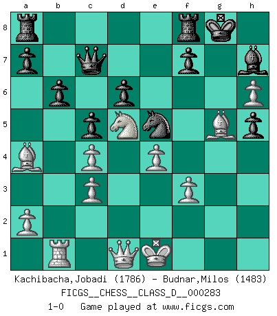 Last move : 1-0 2022 June 13 9:27:20 [Event "FICGS__CHESS__CLASS_D__000283"] [Site "FICGS"] [Date "2022.02.03"] [Round "1"] [White "Kachibacha,Jobadi"] [Black "Budnar,Milos"] [Result "1-0"] [WhiteElo "1786"] [BlackElo "1483"] 1.d4 Nf6 2.c4 e6 3.Nc3 Bb4 4.e3 O-O 5.Bd3 Bxc3 6.bxc3 d6 7.Ne2 e5 8.e4 Bg4 9.f3 Bh5 10.Rb1 b6 11.g4 Bg6 12.h4 h6 13.h5 Bh7 14.g5 hxg5 15.Bxg5 Nbd7 16.h6 g6 17.Bc2 c5 18.Ba4 Qc7 19.dxe5 Nh5 20.Rxh5 gxh5 21.Nf4 Nxe5 22.Nd5 1-0 Nimzo-Indian : 4.e3 O-O, 5.Bd3 Kingside Castling by player Black (move 4) Player White won this chess game. Follow this game move after move (download)To avoid losing a piece, many a person has lost the game. (Savielly Tartakover) Schach ist das schnellste Spiel der Welt, weil man in jeder Sekunde Tausende von Gedanken ordnen muß. (Albert Einstein) El Ajedrez, como cualquier otra actividad creativa, puede existir solo a través de méritos combinados de aquellos que tienen talento creativo y de aquellos que tienen la habilidad de organizar un trabajo creativo. (Mikhail Botvinnik) Horreur, mais aussi harmonie suprême : qu'y avait-il en effet au monde en dehors des échecs ? Le brouillard, l'inconnu, le non-être... (Vladimir Nabokov) A good player is always lucky. (Capablanca)