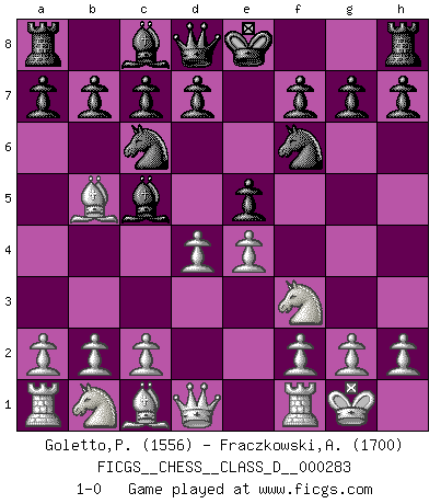 Last move : 1-0 2022 March 27 5:31:15 [Event "FICGS__CHESS__CLASS_D__000283"] [Site "FICGS"] [Date "2022.02.03"] [Round "1"] [White "Goletto,Piero Giuseppe"] [Black "Fraczkowski,Albert"] [Result "1-0"] [WhiteElo "1556"] [BlackElo "1700"] 1.e4 e5 2.Nf3 Nc6 3.Bb5 Nf6 4.O-O Bc5 5.d4 1-0 This chess game has been lost on time (started : 2022.02.03 22:34:47) Ruy Lopez : Berlin defense, Beverwijk variation Kingside Castling by player White (move 4) Player White won this chess game. Follow this game move after move (download)You are for me the Queen on d8 and I am the Pawn on d7 !! (Eduard Gufeld) Charakterschwächen offenbaren sich normalerweise während einer Schachpartie. (Garry Kasparov) Cuando tu casa esta en llamas, no puedes ser molestado por tus vecinos. O, como decinos en Ajedrez, si tu Rey esta bajo ataque, no te preocupa perder un Peón del lado de la Reina. (Gary Kasparov) Mon pion favori sur ma case favorite ! Bronstein en parlant d'un coup de pion en h5 quand il avait les Noirs. You can think I'm wrong, but that's no reason to quit thinking. (Gregory House, House M.D.)