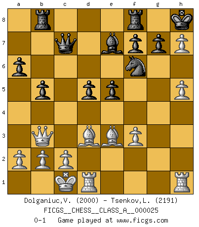 Last move : 0-1 2007 October 7 11:57:15 [Event "FICGS__CHESS__CLASS_A__000025"] [Site "FICGS"] [Date "2007.07.29"] [Round "1"] [White "Dolganiuc,Victor"] [Black "Tsenkov,Ljubomir"] [Result "0-1"] [WhiteElo "2000"] [BlackElo "2191"] 1.e4 c5 2.Nf3 d6 3.d4 cxd4 4.Nxd4 Nf6 5.Nc3 a6 6.Be3 e5 7.Nb3 Be6 8.Qd2 Be7 9.f3 O-O 10.O-O-O b5 11.Nd5 Bxd5 12.exd5 Qc7 13.g4 Nbd7 14.g5 Nh5 15.Na5 Nf4 16.h4 Nxd5 17.Qxd5 Qxa5 18.h5 Qc7 19.Bd3 Rab8 20.g6 Nf6 21.gxh7+ Kh8 22.Qb3 d5 0-1 Sicilian : Najdorf, Byrne (English) attack Kingside Castling by player Black (move 9) Queenside Castling by player White (move 10) Player Black won this chess game. Follow this game move after move (download)Personally, I rather look forward to a computer program winning the world Chess Championship. Humanity needs a lesson in humility. (Richard Dawkings) Es gibt Leute, die glauben, alles wäre vernünftig, was man mit einem ernsthaften Gesicht tut. (Georg Christoph Lichtenberg) El pensamiento metódico es mas útil en el Ajedrez que la inspiración. (C. J. S. Purdy) Lorsque vous vous retrouvez devant une position atroce, ne tendez pas un ultime piège dérisoire avec l'intention d'abandonner si l'adversaire le déjoue ! Faites-vous plutôt un devoir de résister comme si votre vie en dépendait. Jouez le coup qui vous déplairait au centuple si vous étiez dans la peau de votre tortionnaire ! There's always a bigger fish. (Qui-Gon Jinn in Star Wars ep.1)