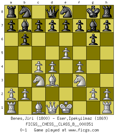 Last move : 0-1 2022 March 24 0:53:13 [Event "FICGS__CHESS__CLASS_B__000351"] [Site "FICGS"] [Date "2022.02.06"] [Round "1"] [White "Benes,Jiri"] [Black "Eser,Ipekyilmaz"] [Result "0-1"] [WhiteElo "1800"] [BlackElo "1869"] 1.e4 g6 2.d4 Bg7 3.c4 Kf8 4.Nc3 b6 5.f4 Bb7 6.Nf3 Nf6 7.Bd3 Kg8 8.e5 Ne8 0-1 This chess game has been lost on time (started : 2022.02.06 15:43:44) Robatsch (Modern) defense Player Black won this chess game. Follow this game move after move (download)When in doubt... play Chess ! (Tevis) Der Traum, für den ich lebe, ist der von einem freien Russland. Viele mögen sagen: Russland hat doch ein Parlament, einen gewählten Präsidenten. Aber ich spüre, dass in meiner Heimat die Angst wiederkehrt. Eine Angst, sich frei zu äußern, bestimmte Dinge zu tun (Garry Kasparov) Cuando estes solo, cuando te sientas un extraño en el mundo, juega al Ajedrez. Esto levantará tu espiritu y será tu consejero de guerra. (Aristóteles) Les Echecs sont et restent toujours un combat, un combat intégral comme la boxe, la lutte ou un autre sport, et où il doit y avoir un vainqueur et un vaincu. (Joseph Emil Diemer) A good teacher is like a candle - it consumes itself to light the way for others. (Author unknown)